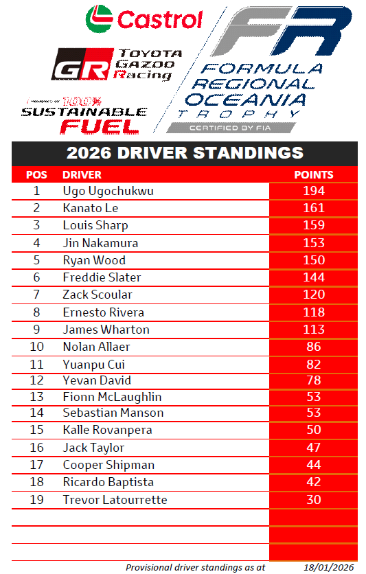 Hitech’s Jin Nakamura sits three points ahead of Wood, with mtec Motorsport team mate Louis Sharp nine points ahead, and Hitech’s impressive Kanato Le is Ugochukwu’s primary challenger, three points ahead of Sharp.