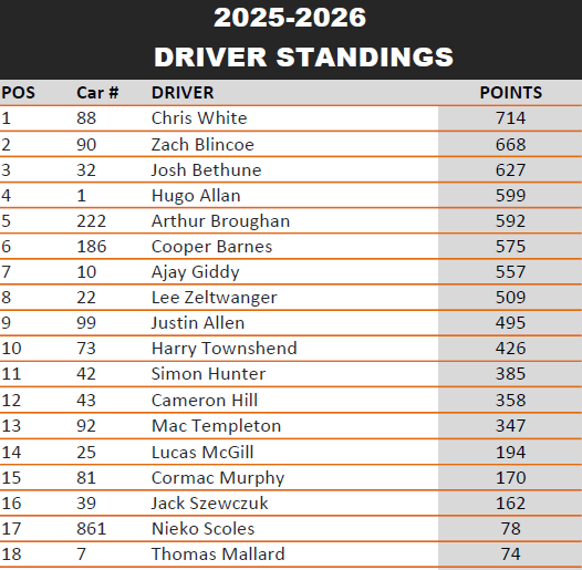 Slightly further back in the championship standings in fourth is reigning champ Hugo Allan, and he must have a massive weekend in the Manawatu to give himself a fighting chance of retaining his title when the series heads to Taupo and Supercars in April for the final round.