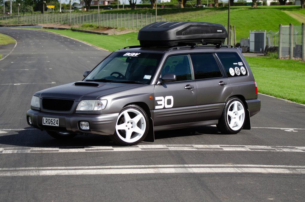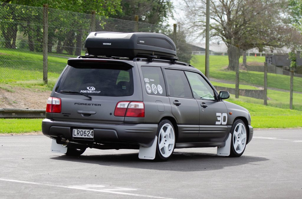 To make the Forester look smart, brand new wheels and semi-slick tyres have been supplied by BG World Wheels, Kartboy short shifter, a cool shift knob from Naughty Knobs NZ, Cruz roof racks and a Yakima roof box donated and professionally fitted by Roof Racks NZ, and the car has been completely wrapped in satin dark grey.