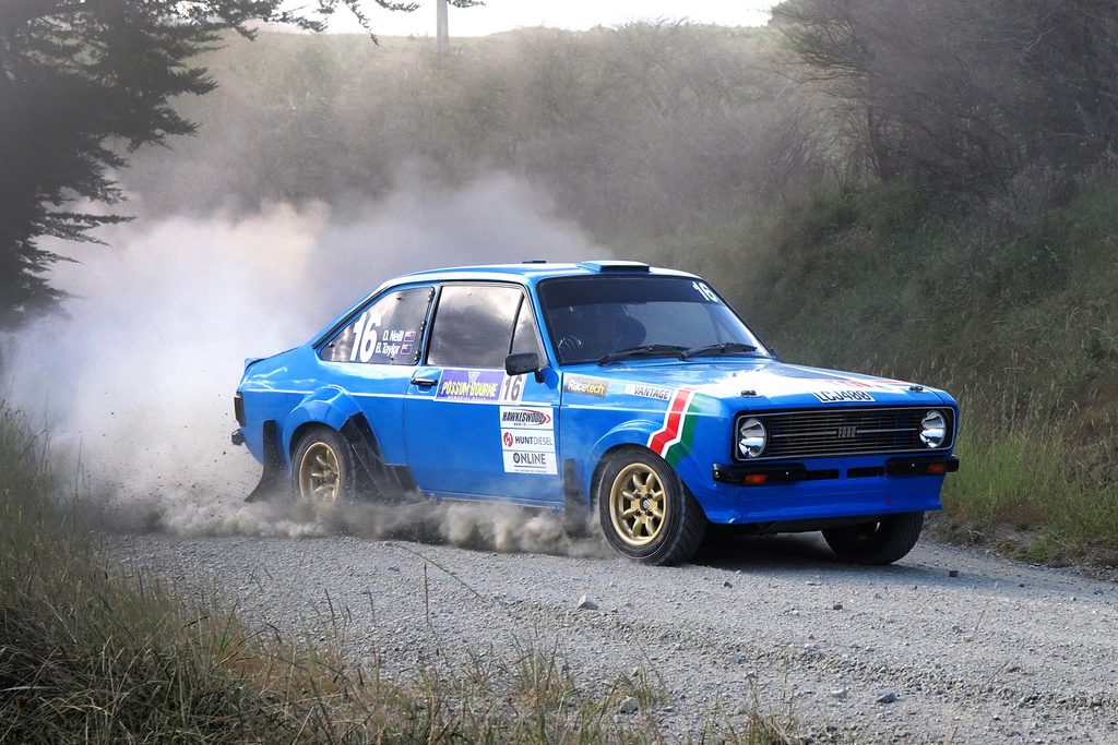 Having switched from Class D to Class E (Classic 2WD), Brent Taylor teamed up with Dave Neill (Ford Escort Mk2) and was first home ahead of Kyle Percival/Maddy Buhr (Ford Escort Mk2). The expected battle with Mark Parsons and Mal Clark (TR7 V8 Triumph) dissipated after Parsons retired from SS1 with a clutch issue.