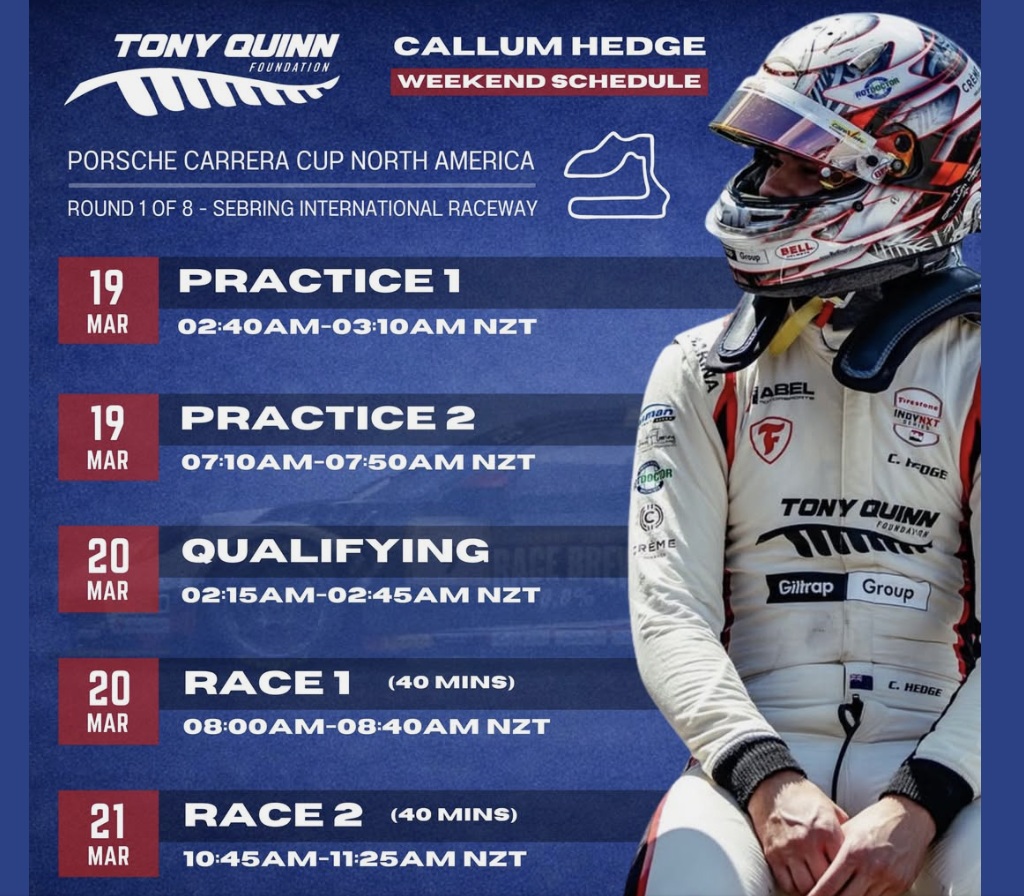 For the first time since his title-winning campaign in 2023, Tony Quinn Foundation Ambassador Callum Hedge is back behind the wheel of a Porsche, as the Kiwi prepares to make his Porsche Carrera Cup North America debut this weekend at Sebring International Raceway.