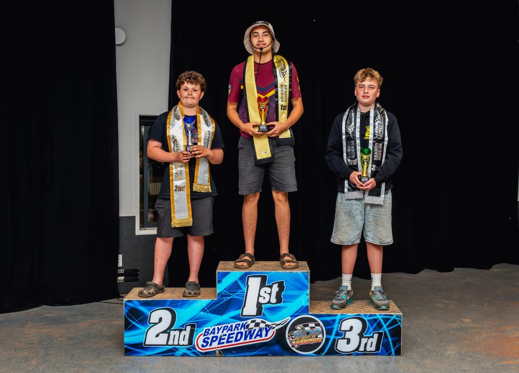 Rotorua’s Reeve Transom was a clear winner in the first race, while Hawke’s Bay visitor Troy Peach won the second, and Aucklander Steven Skelton was the third winner of the night. Skelton tied on 71 points with Auckland’s Korbin Sales (who notched up two seconds and a sixth), with Skelton recording the faster lap of the pair to decide the tie.
