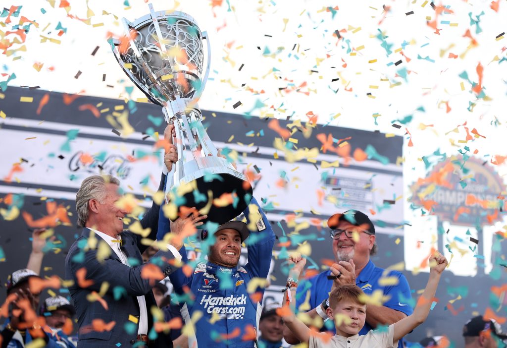 Kyle Larson celebrating his championship title last year. Image: Meg Oliphant/Getty Images