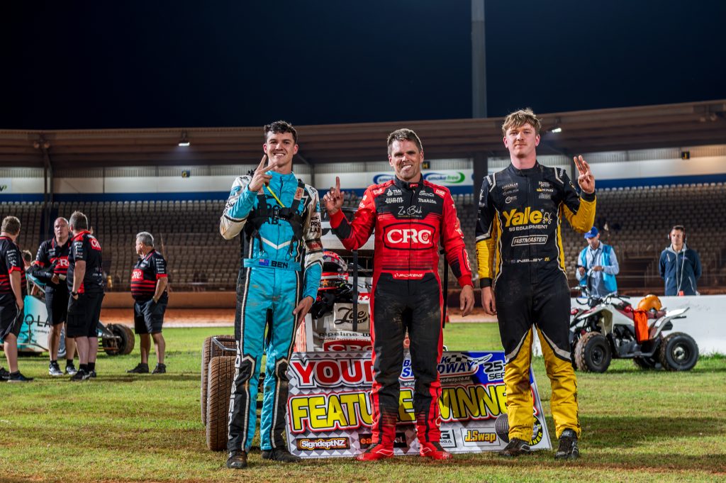 Ten-time New Zealand champ Michael Pickens used his experience to battle his young challengers and claim the 30-lap feature victory, while the racing throughout the pack saw a constantly changing running order and side-by-side action.