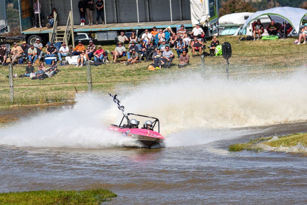 The Southern Jet Superboat final had spectators on the edges of their folding chairs. Simon and (navigator) Sarah Gibbon were expected to be first on the water, but mechanical trouble kept their boat on the trailer, and they had to be satisfied with third place. Next up, Sam Newdick and navigator Shama Putaranui exploded out of the starting channel and ran a climactic 46.363 seconds. It was the fastest time of the day for about a minute.