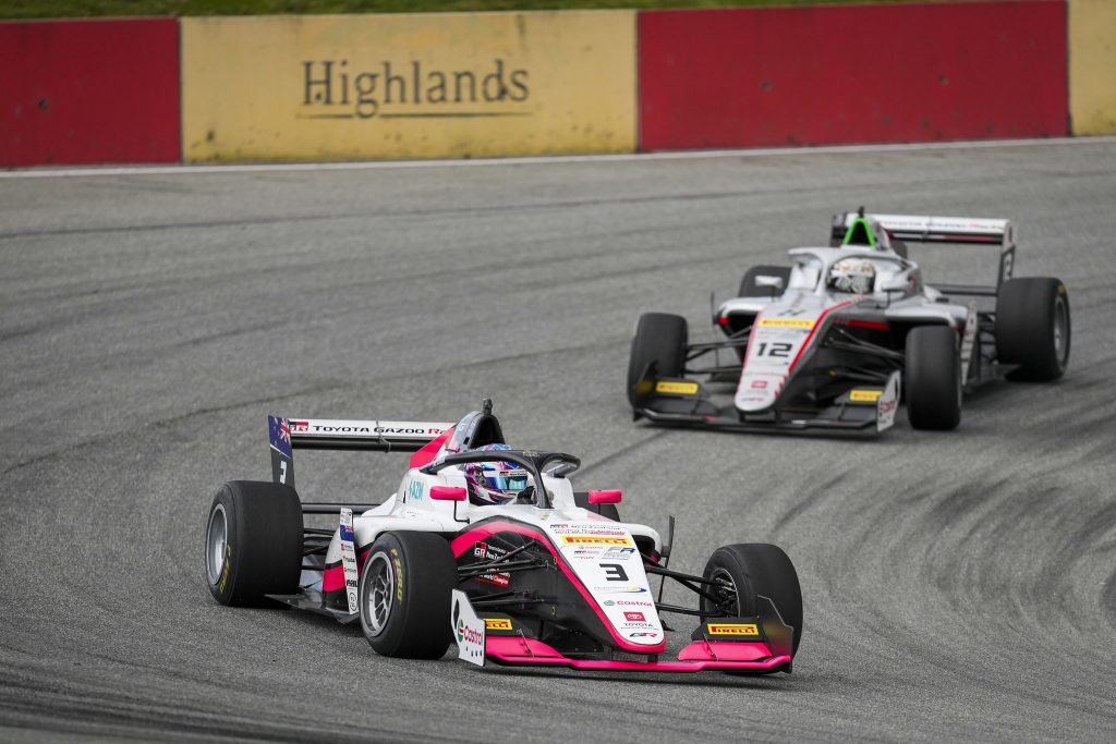 Scoular quickly settled into a good rhythm and once again started to push away, but the two Hitech cars managed to hang on as before, unable to challenge. A push-to-pass move nearly caught him out on lap 16 but ended up gaining Zack another tenth, and a bit more again when Nakamura momentarily lost the rear and some momentum in his chase of the leader.