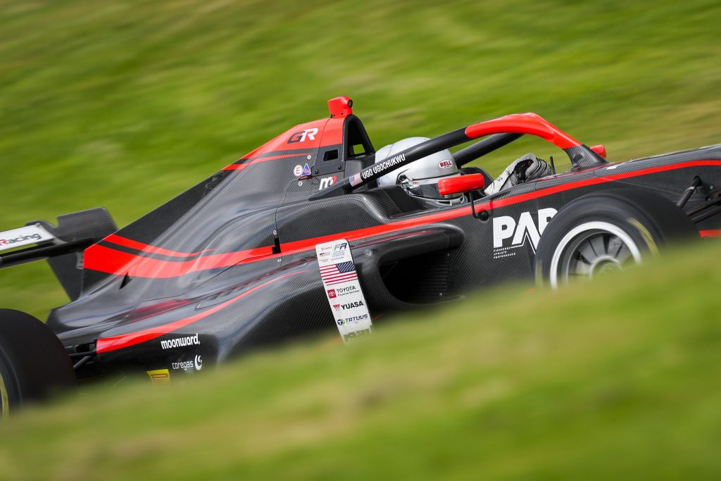 Scoular was the man with pace, dragging the two Hitech drivers in their silver FT60s with him as he built an advantage. Nakamura used a push-to-pass on lap five to close back up and set the fastest lap of the race so far, but he could not sustain the pressure on the leader. Further back, Allaer’s wild ride had punctured his left rear, and he headed to the pit lane for fresh rubber.